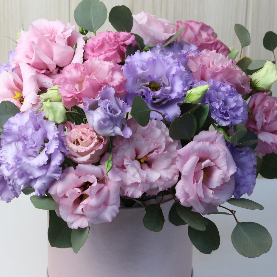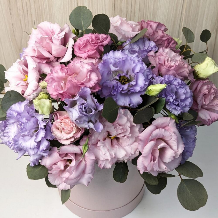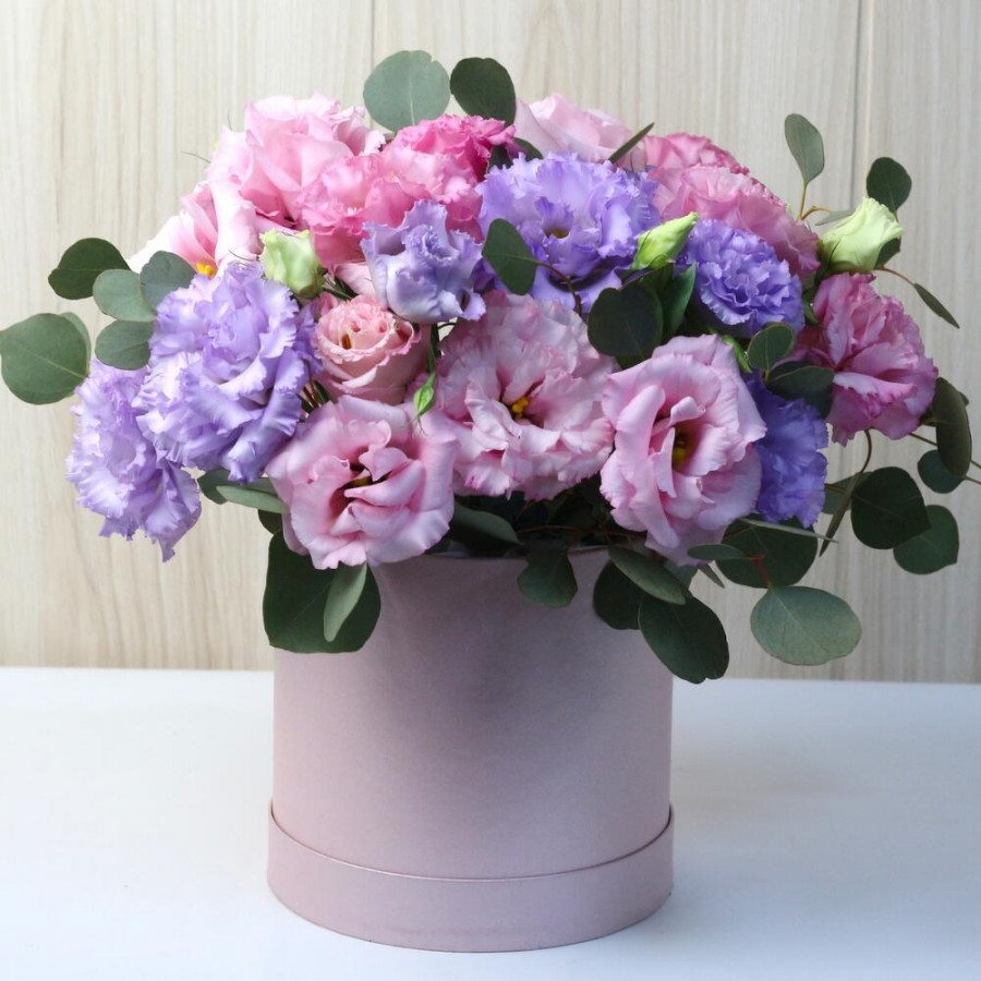 На фото букет из 15 розовых и сиреневых эустом в коробке. В составе: эустома (лизиантус) 15 шт, оазис флористический 1 шт, шляпная коробка (m) 1 шт, атласная лента 1 шт, . Все цветы свежие и ароматные, букет красиво оформлен и отлично подходит для подарка. Доступна доставка цветов или самовывоз.