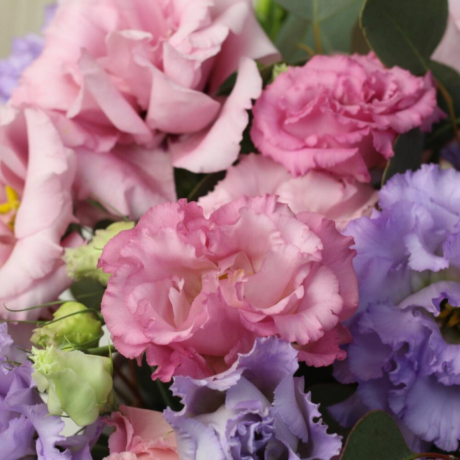 Букет из 15 розовых и сиреневых эустом в коробке фото 3