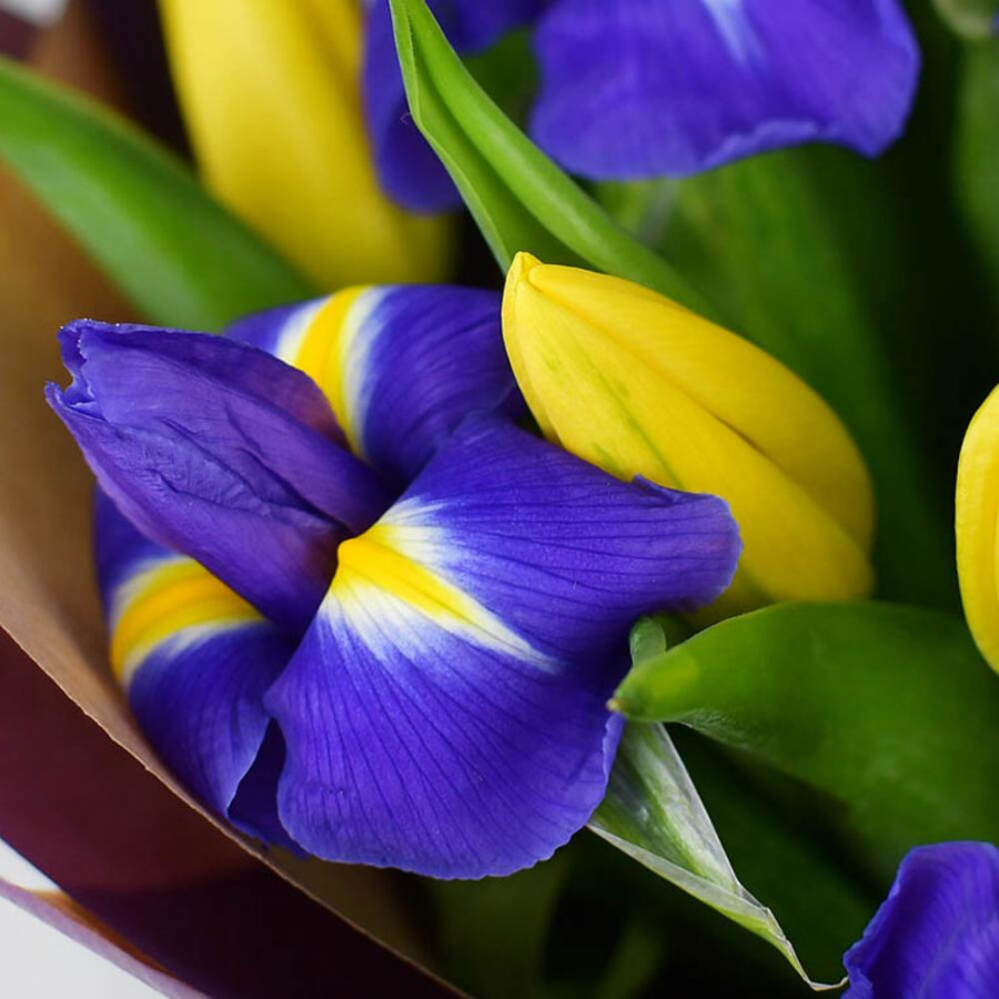 Букет из синих ирисов и желтых тюльпанов