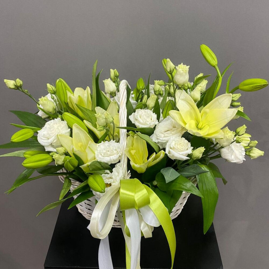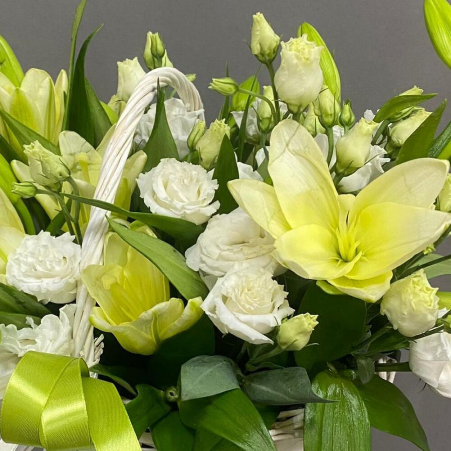 На фото корзина с белыми лилиями и эустомами. В составе: лилия 5 шт, эустома (лизиантус) 6 шт, корзина (s) 1 шт, атласная лента 1 шт, . Все цветы свежие и ароматные, букет красиво оформлен и отлично подходит для подарка. Доступна доставка цветов или самовывоз.
